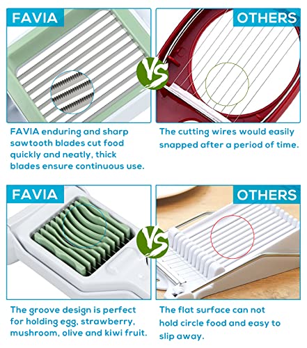 - MULTIFUNCTIONAL EGG SLICER- It is not only hold with one hand when slicing food, but also stably set on the table just simply press the upper handle to get a beautiful sliced ingredient. Perfect for slicing hard-boiled egg, mushroom, strawberry, banana, tomato, kiwi fruit, soft cheese and other soft ingredients, slicing more quick, easy and neat, make food looks nice and cook evenly.